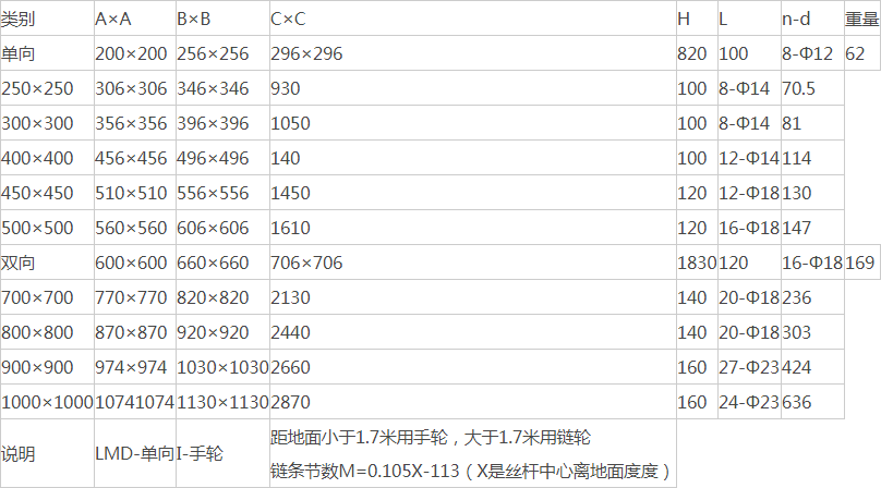 主要由框架、閘板、絲桿、螺母等零件構成,用手轉動手輪使絲桿帶著絲桿螺母和閘板沿水平方向往復運動,達到閘門的啟閉目的。